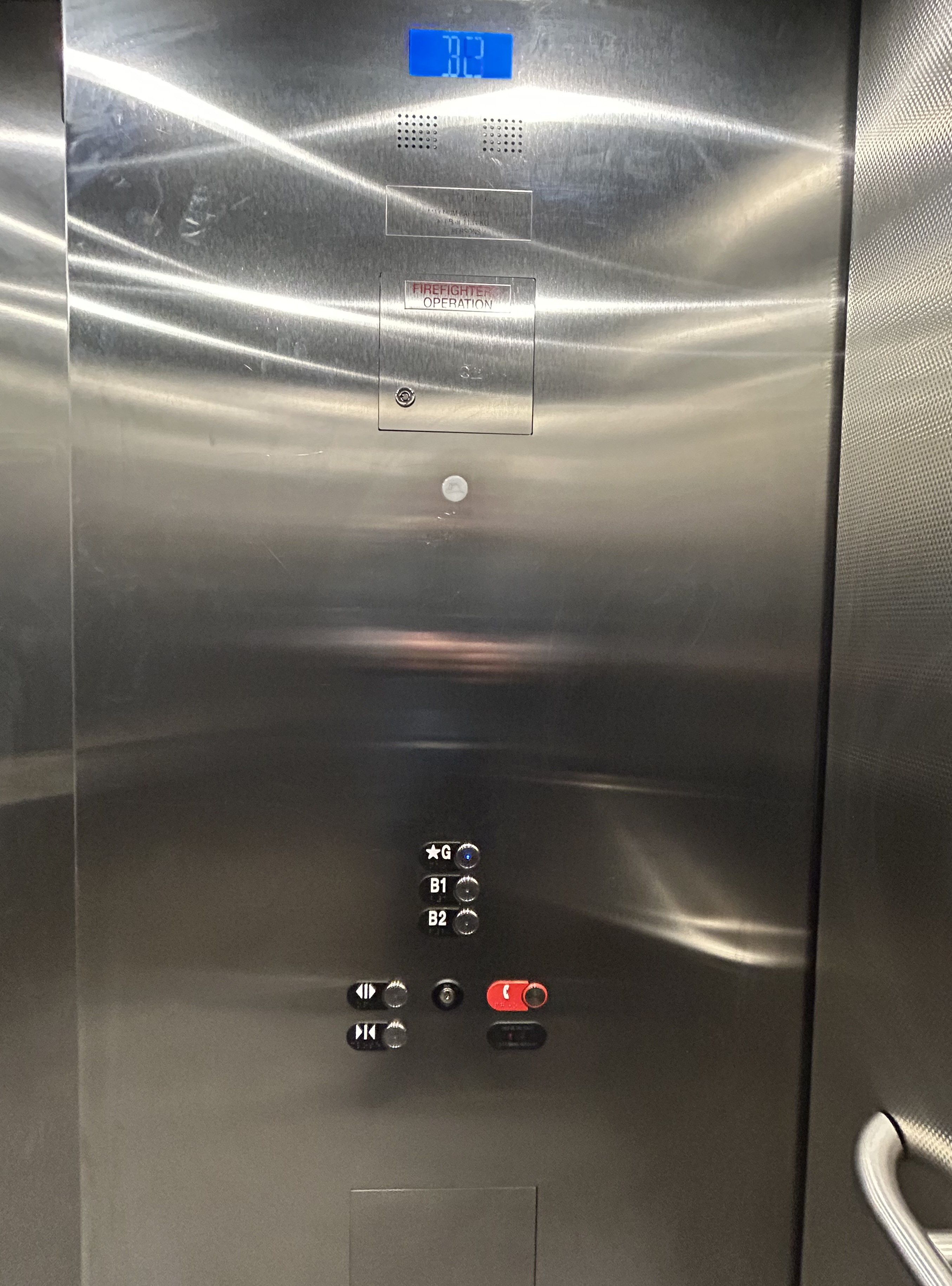 Once inside the elevator, there is no information other than buttons marked “G”, “B1”, and “B2”. There is nothing to tell the elevator user what is accessible from each floor.