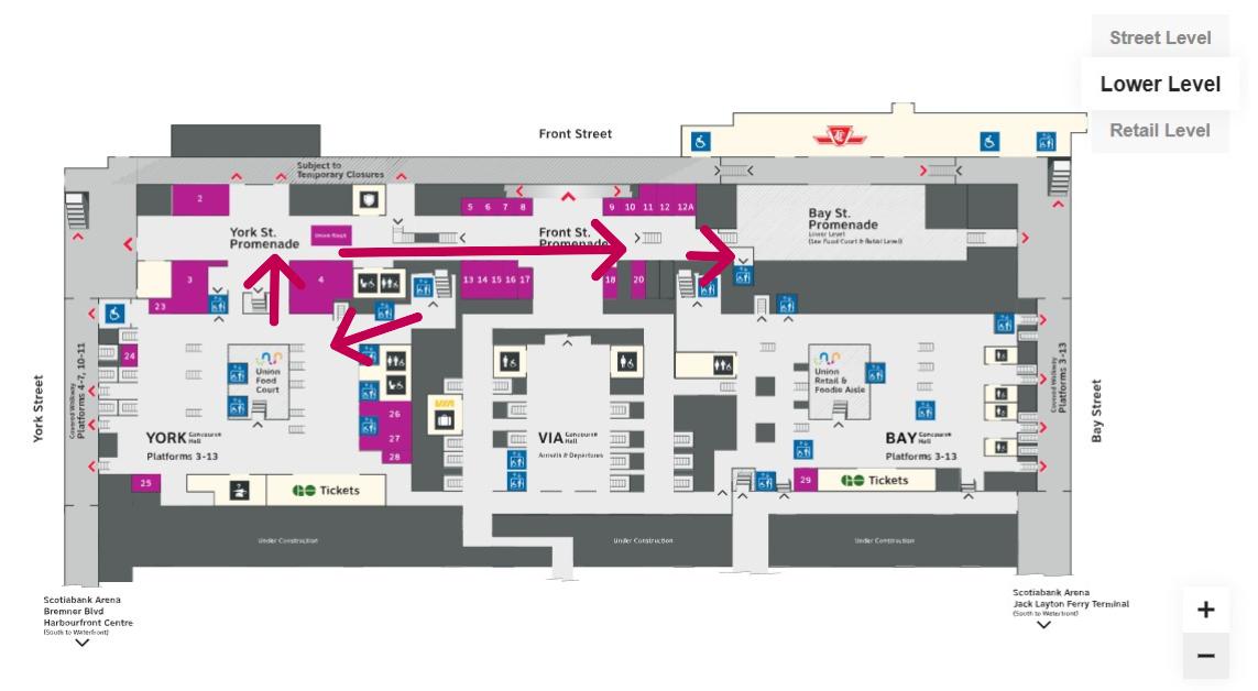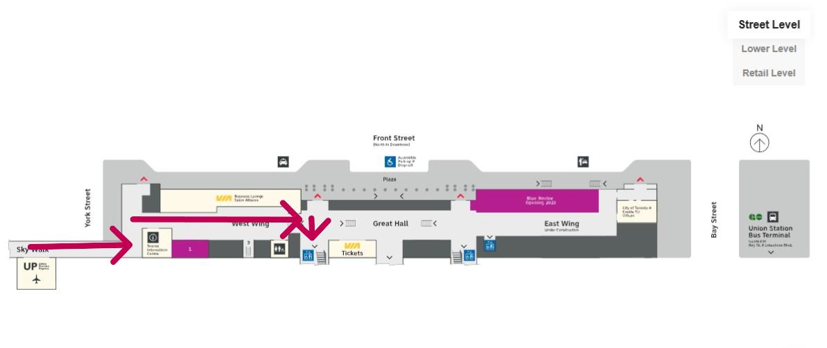 Confusingly, the official Union Station map directory calls the three levels “Street Level” (G, the Heritage structure including the Great Hall, West and East Wings, along with the path towards UP Express and the Skywalk), “Lower Level” (B1, the GO York and Bay Concourses, the concourse beneath the Great Hall, and the VIA departure area) and “Retail Level” (B2, including the food court, food hall, and connections to the subway). In the elevators, the audio prompts only mention the three level names.