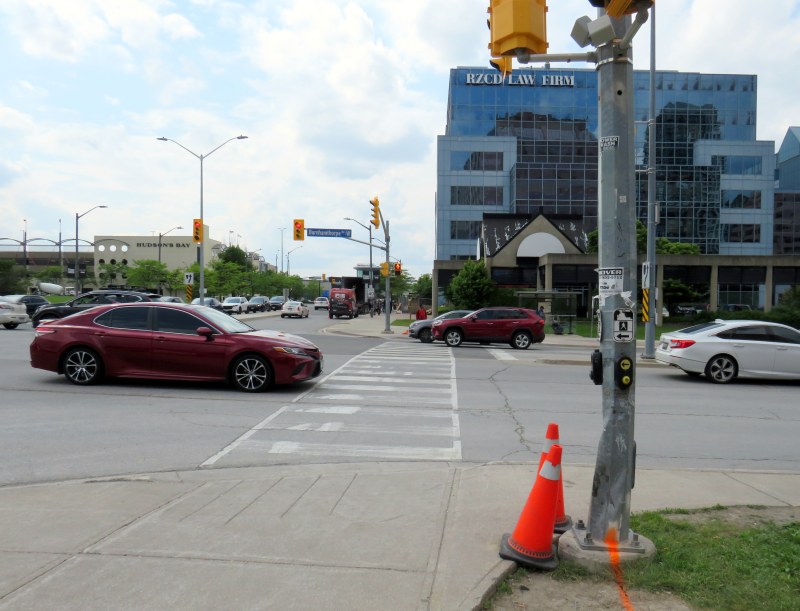 While I visited The MUP on the north side of Burnhamthorpe west of Kariya Drive was also closed off for the convenience of the builders of the Exchange District Condos development, one of many new mixed-use projects in the area. This forces pedestrians to cross the intersection to continue west, and no thought was made to closing one of the three westbound traffic lanes to provide a continuous path.