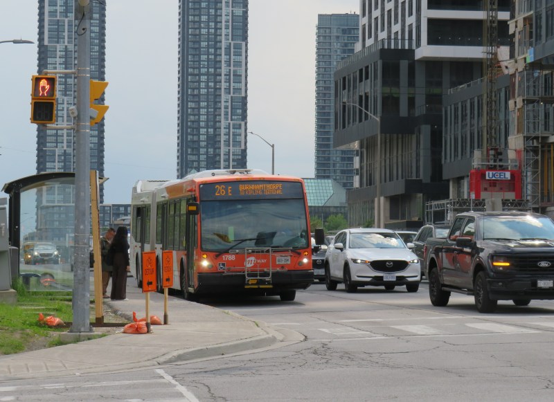 The corner is also a busy transfer point. Miway route 26 Burnhamthorpe is a major east-west bus corridor that connects with the TTC subway at Kipling Station; Kariya Drive is the best stop to get to Square One as Route 26 doesn’t serve the main terminal. Routes 3 Bloor and 8 Cawthra, which do continue to the City Centre Terminal, stop here as well.