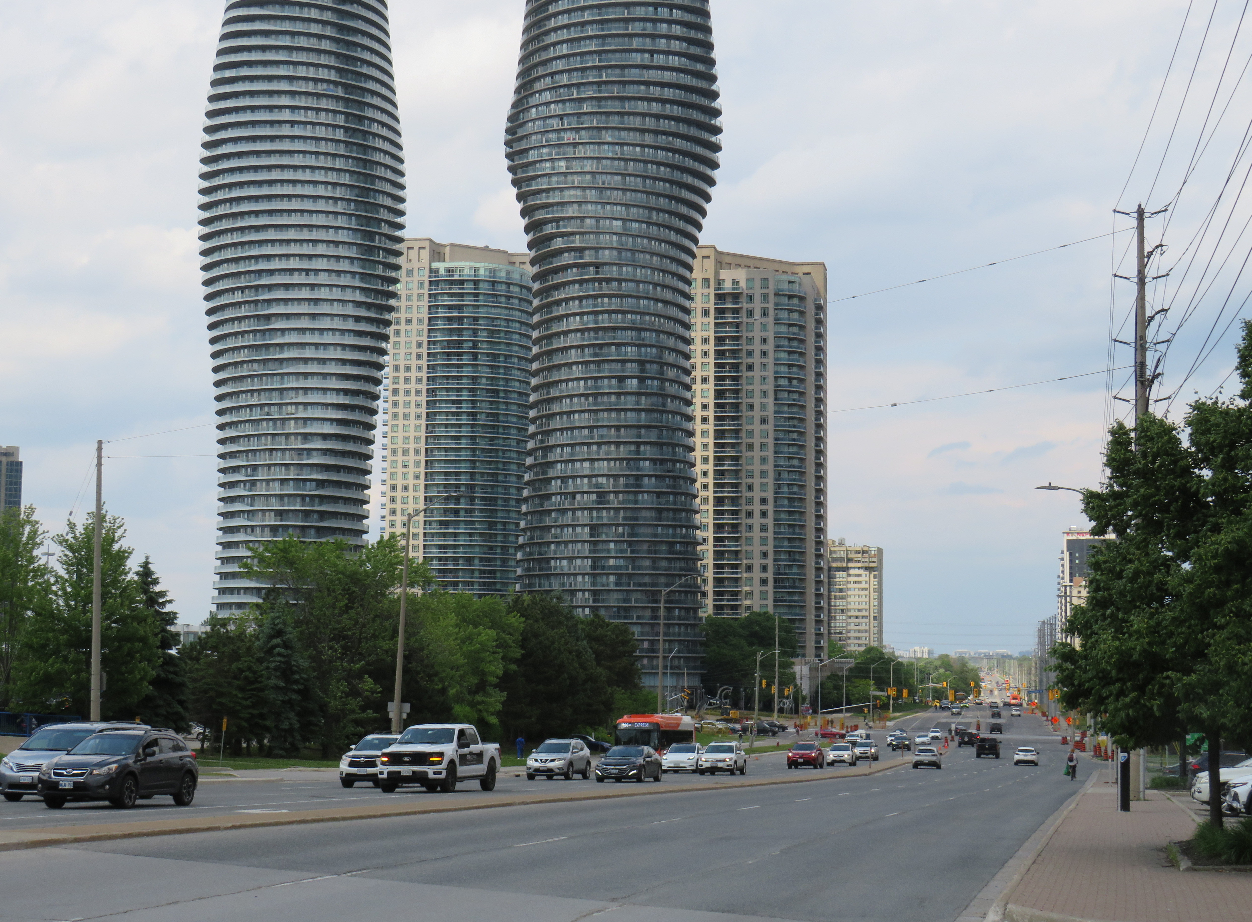 The intersection of Burnhamthorpe and Kariya is within the busy, urbanizing Mississauga City Centre (MCC) neighbourhood. MCC, also known as Downtown Mississauga, is the political, commercial, and cultural centre of the sprawling suburb of 750,000. The area is centred around Square One Shopping Centre, which opened in 1973, expanding several times in the next four decades to become one of Canada’s largest malls. Immediately to the west of Square One is Mississauga’s post-modern city hall, which is one of the most interesting and walkable civic centres in Ontario. Nearby is a performing arts theatre, a Sheridan College campus, several office buildings, a YMCA, central library, parks, a transit hub, as well as many high-rise residential towers. Newer residential development includes streetfront retail, oriented to the community with local restaurants, cafes, pharmacies, and grocery stores. Despite its greenfield suburban origins, Mississauga City Centre has become a true 15-minute city.