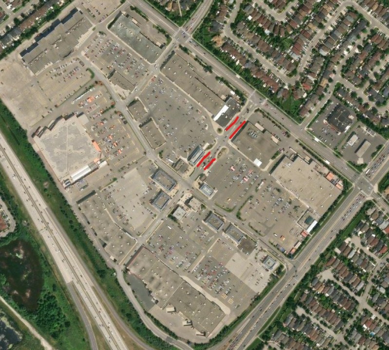 In my hometown of Brampton, for example, two of the three major transit terminals were Bramalea City Centre and Shoppers World. Mississauga’s main transit hub is at Square One mall; Hamilton has large bus loops at Limeridge and Eastgate malls, and London has transit hubs at Masonville Place and White Oaks Mall. Smaller cities and towns such as Belleville, Orillia, and Peterborough would also be sure to serve the local shopping mall with at least one route stopping on the mall property, typically in a space set aside on a mall driveway.