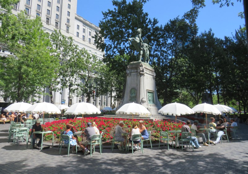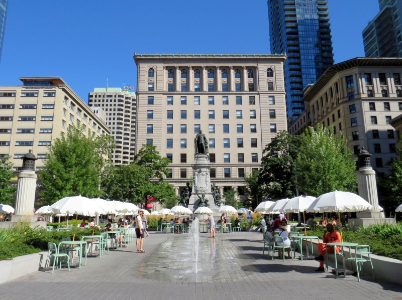 Several public squares were also renewed in recent years. Phillips Square, on Rue Ste-Catharine across from the now-shuttered Hudson’s Bay department store, was renewed with new splash fountains along with small café-style tables and chairs, complete with shade umbrellas. The metal chairs are movable, allowing larger groups to sit around a single table. It’s a refreshed natural congregation point along the city’s main shopping street.