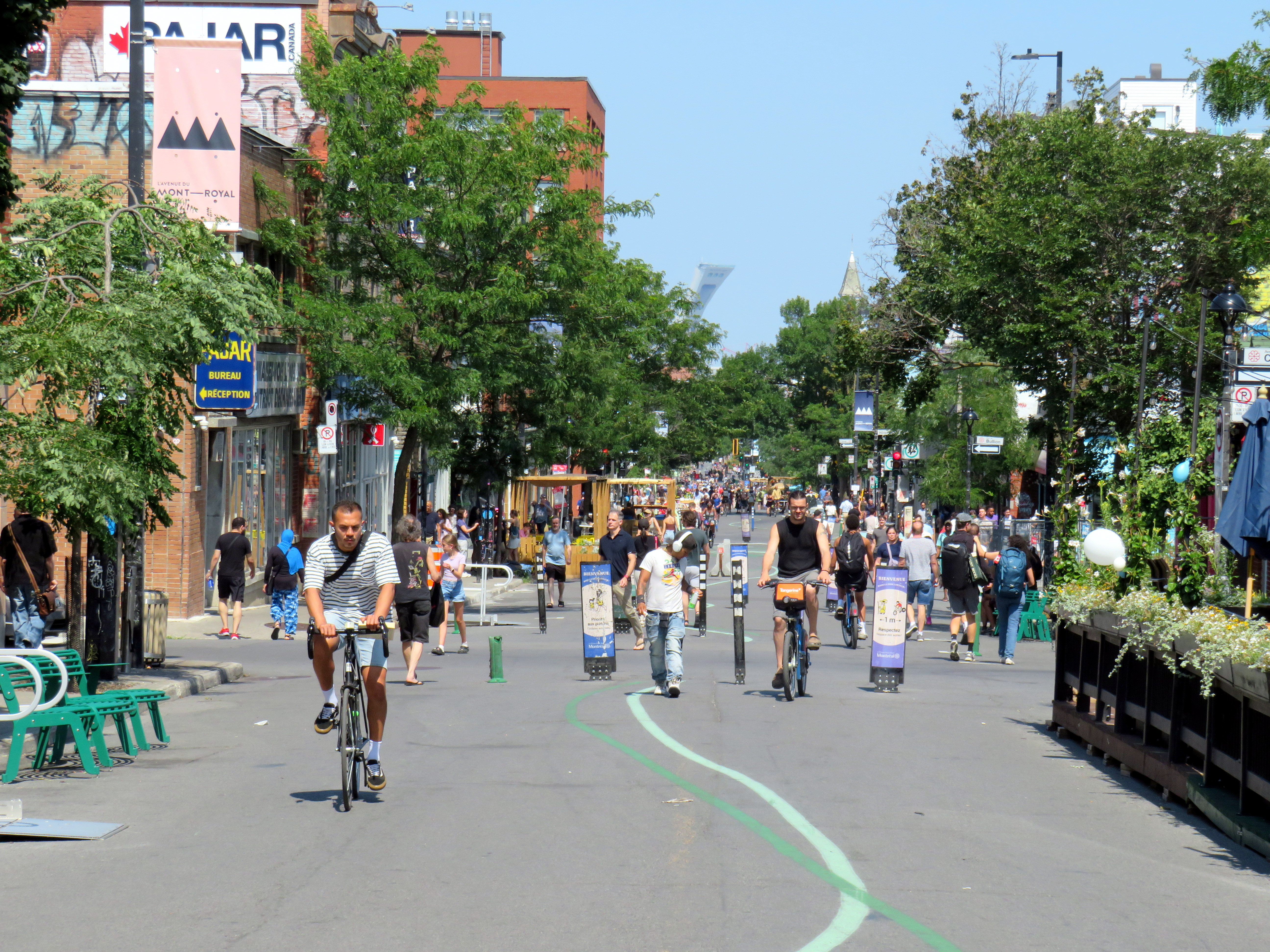 A visit to Montreal can make one jealous. Jealous of the city’s better street furniture, greater cycling infrastructure, great public spaces throughout the city, and an improved pedestrian realm. Entire streets are closed in the summer months to motor traffic, allowing pedestrians to spill out into the roadway, and patios to sprout without the need for concrete blocks to protect them (and less noise and pollution to those dining al fresco).