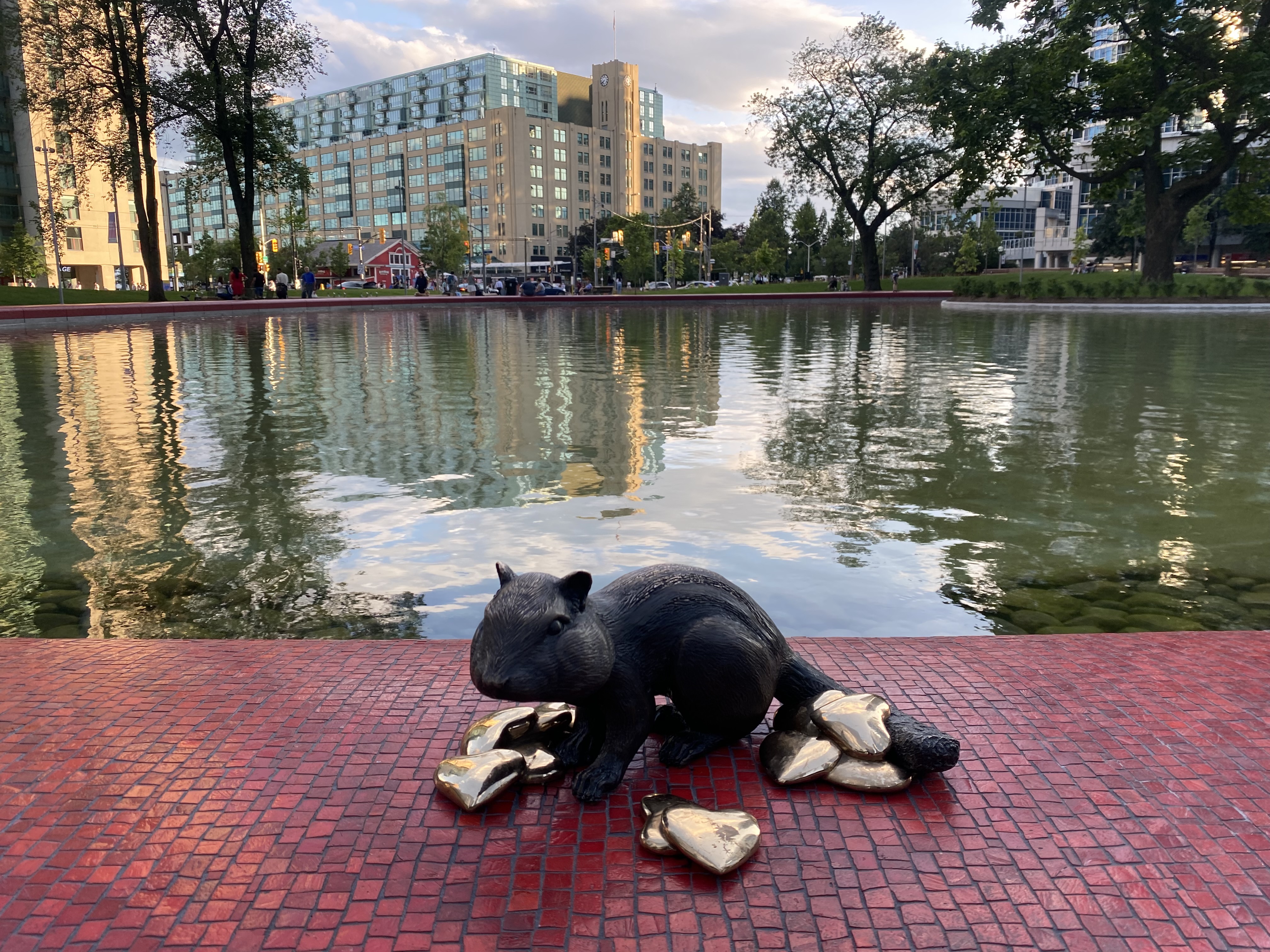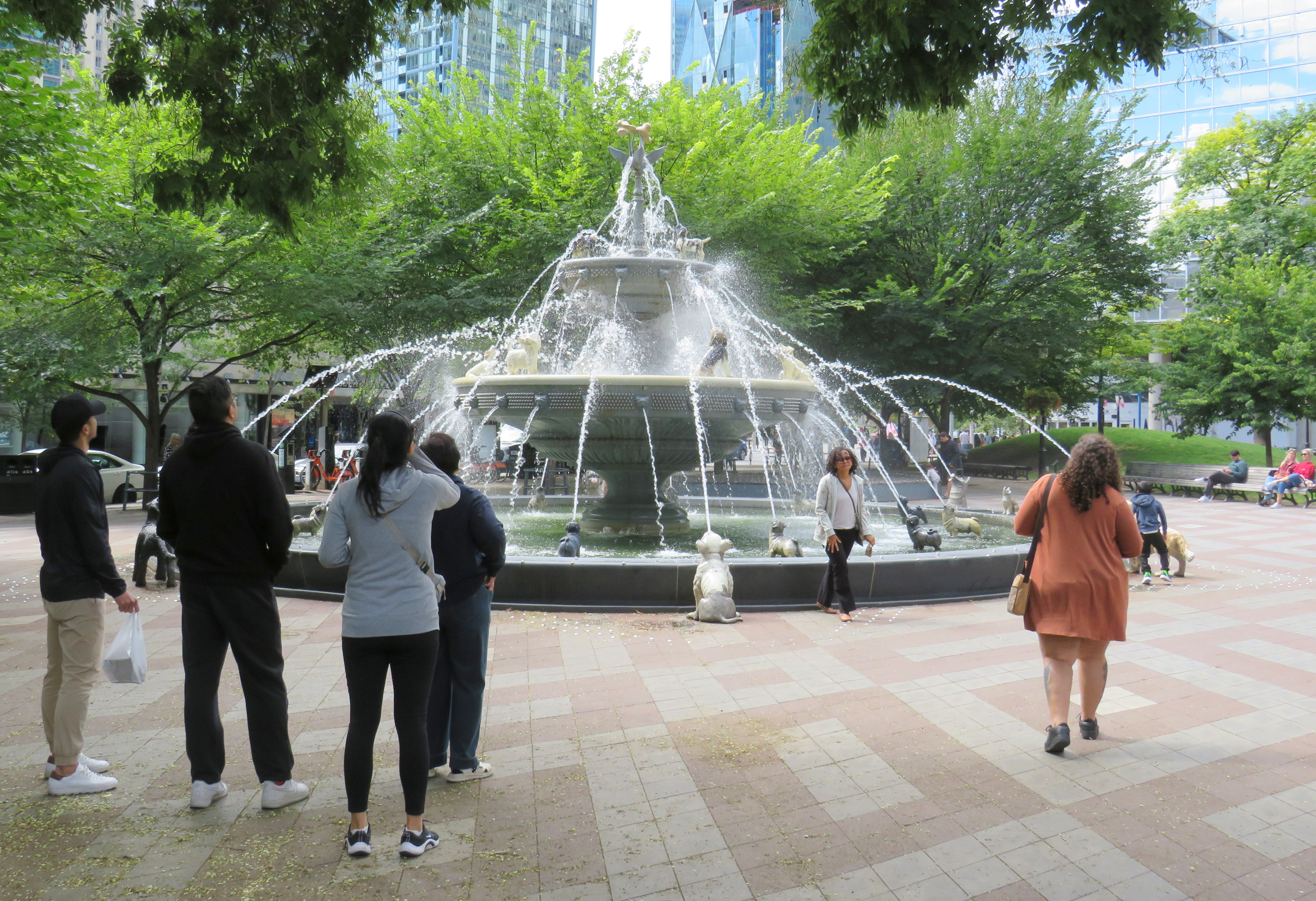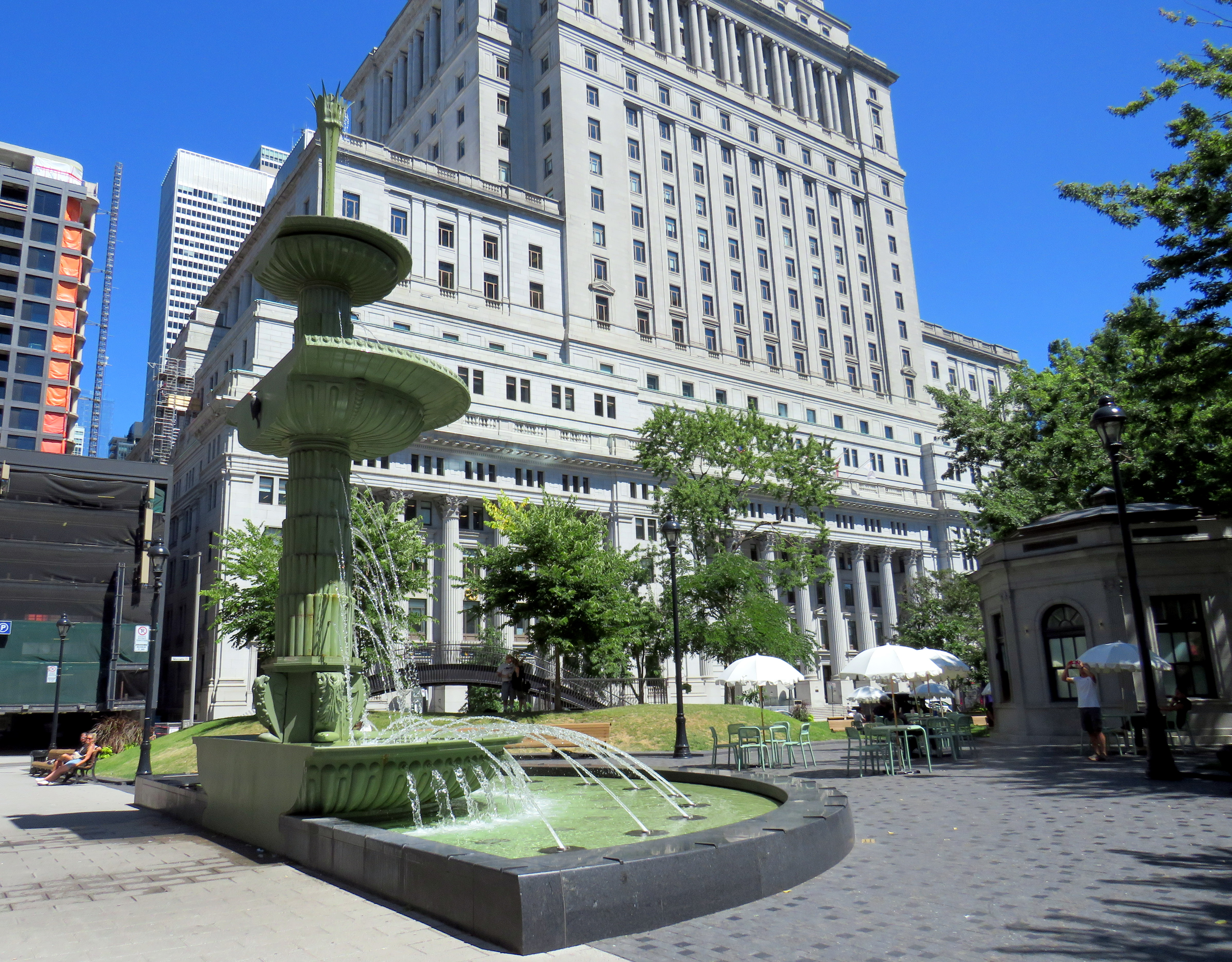Similar tables and umbrellas were set up at Dorchester Square, several blocks to the west, near Mary, Queen of the World Cathedral and Central Station. Both squares were reimagined by the brilliant landscape architecture firm Claude Cormier + Associés. At Dorchester Square, a new water fountain, seemingly a classic installation, is cut in the rear, with a woodpecker behind. Such Easter eggs are features of Cormier park projects.