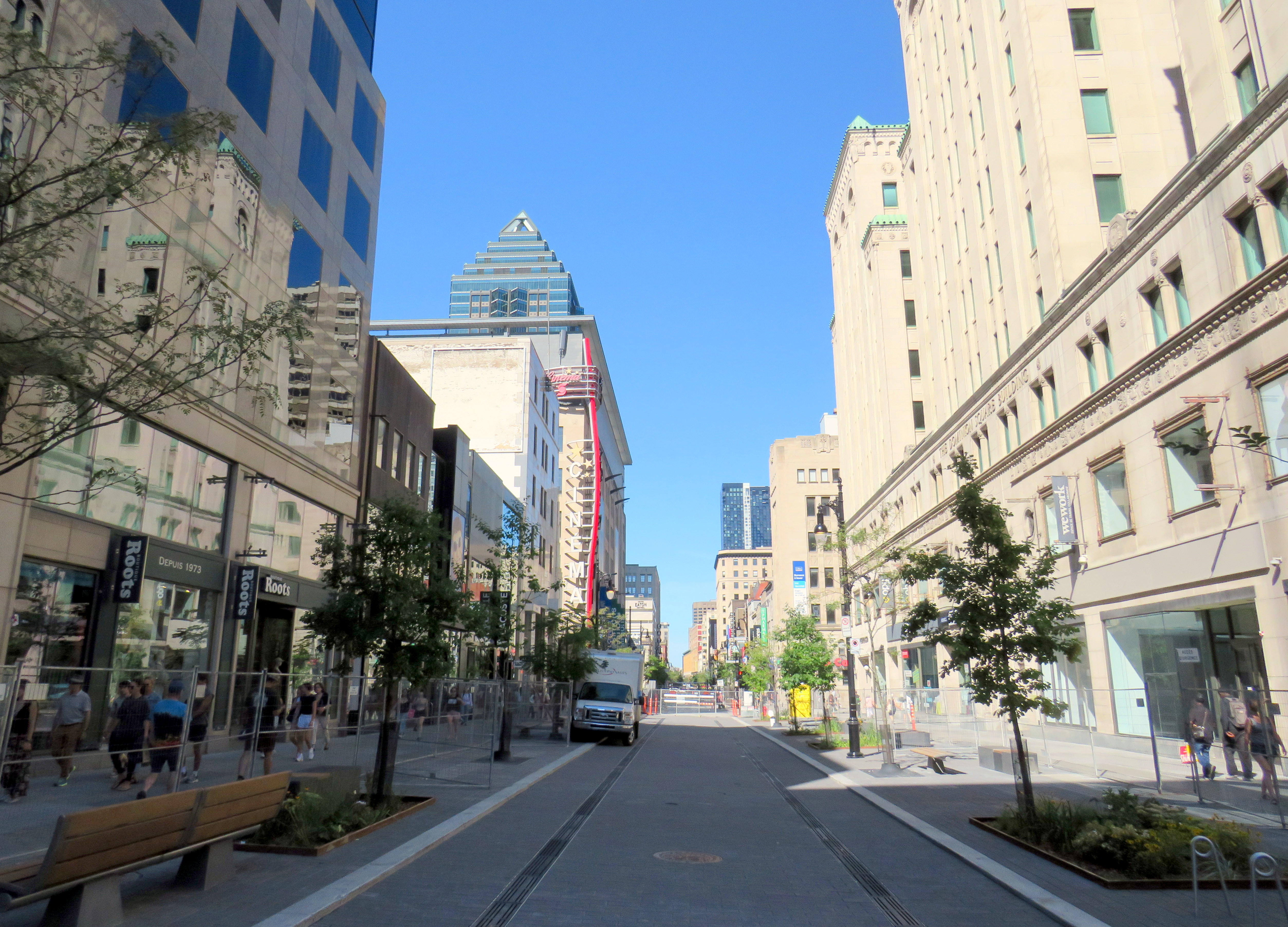 Furthermore, Montreal is rebuilding the western section of Rue St-Catharine towards Crescent. Though motor vehicles are permitted after reconstruction, they are limited to a single through lane, with lay-bys for deliveries, passenger pick-ups and drop-offs, and emergency vehicles. Sidewalks are widened considerably, with more benches, bicycle parking, and street trees.