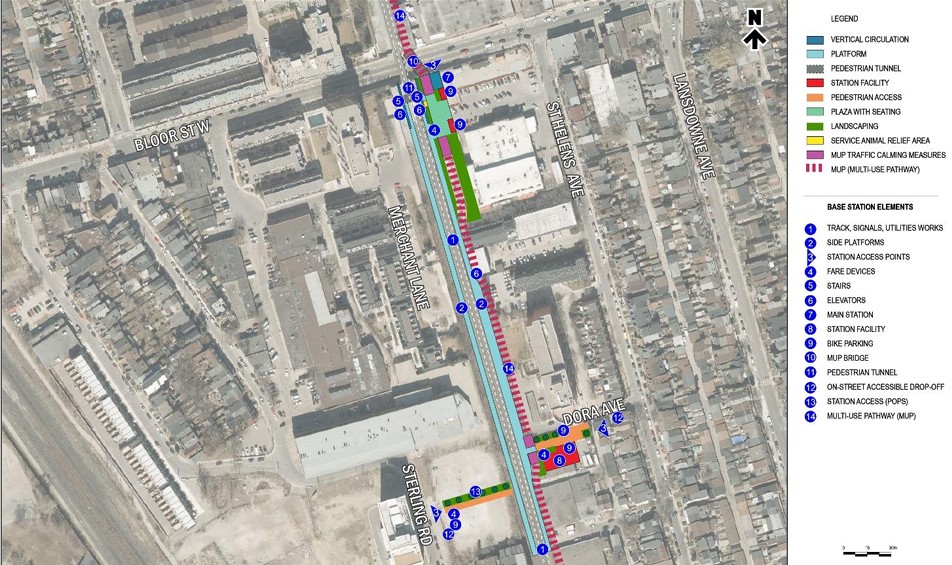 Bloor-Lansdowne Station, one of five “SmartTrack” stations planned for existing GO Transit rail lines in the City of Toronto, is located just south of Bloor Street West on the GO Barrie Line, and south of the Davenport Diamond grade-separation. The purpose of this new two-platform GO station is to provide a new connection between GO trains and the TTC subway, similar to existing stations like Bloor/Dundas West, Danforth/Main Street, or Downsview Park. Unfortunately, it will not be an easy transfer.