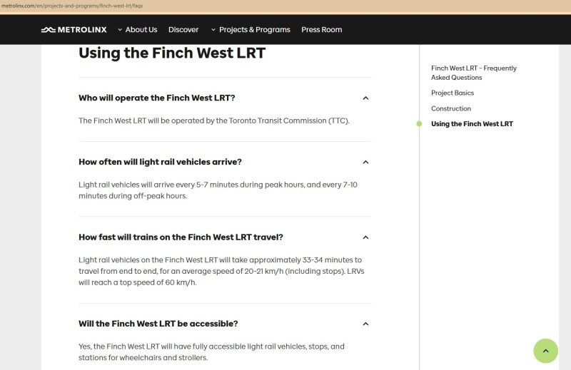 As with all proposed Transit City routes (with the exception of the tunneled central section of the Eglinton-Crosstown LRT), there were always going to be compromises on Finch that would not make it a true rapid transit service. Situated almost entirely on the surface, Line 6 trains are easier for residents to access than subways in deep tunnels; closer stop spacing was intended so the new transit line continues to serve the needs of those who live, work, go to school, and frequent the corridor, without the necessity of a parallel local bus. Anyone expecting subway speeds were in for disappointment.