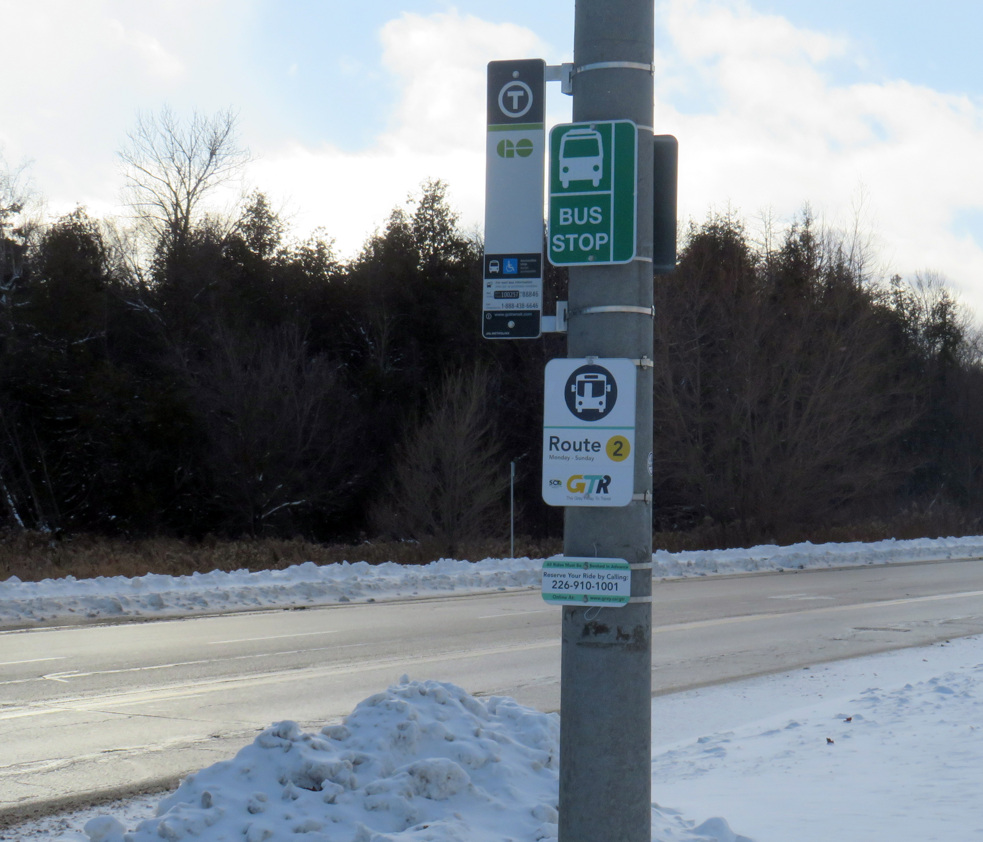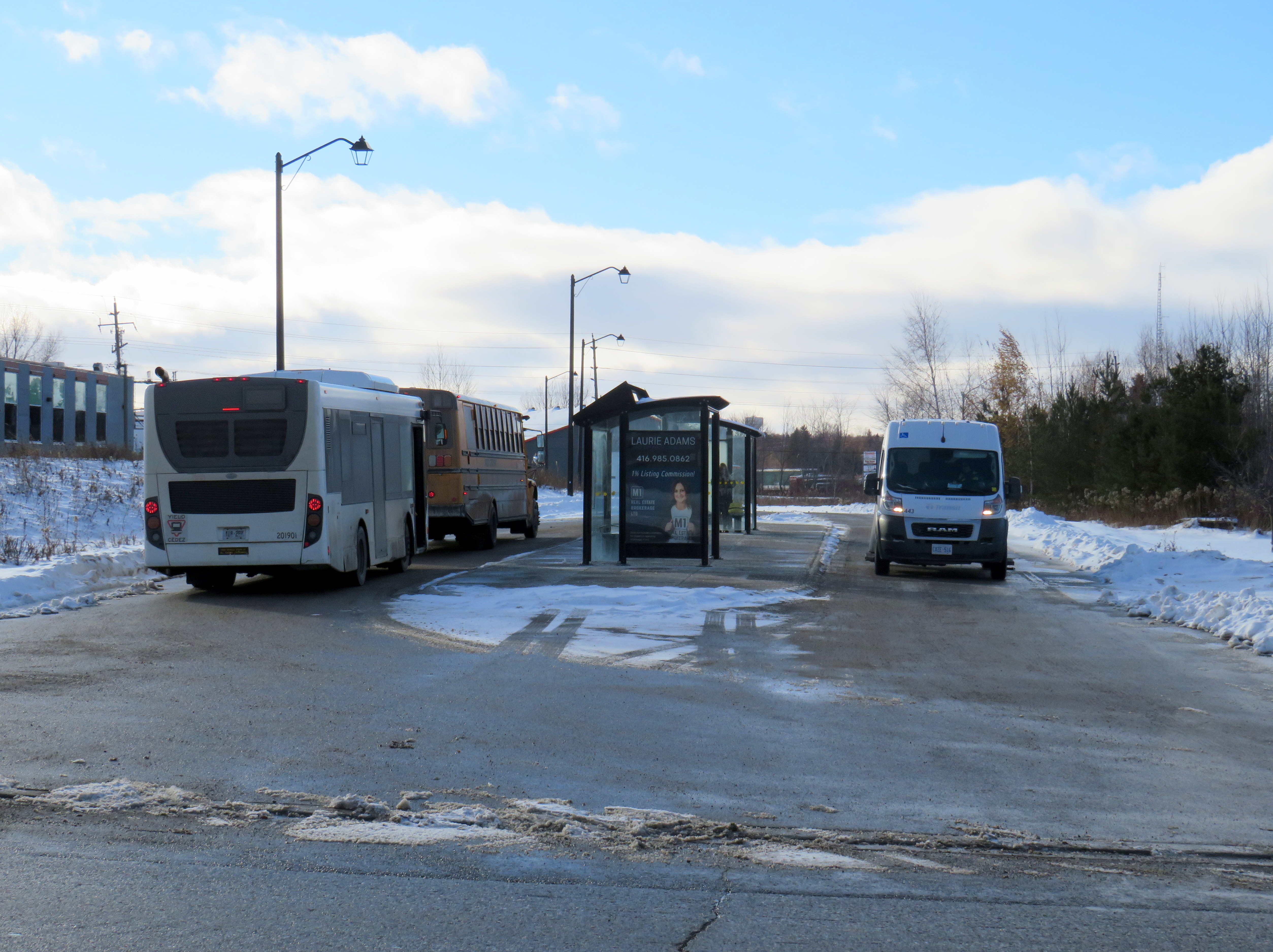After a winding route through several residential subdivisions, circling back on Hansen Boulevard, the bus arrived at the central transfer point located in a field west of the downtown core. The transfer point, located behind a small shopping plaza, is adjacent to the abandoned Orangeville-Brampton Railway corridor. However, the new terminal is not served by GO or GTR. GO Transit buses layover at the old Canadian Pacific Railway station site on Townline before heading south to Brampton GO Station.