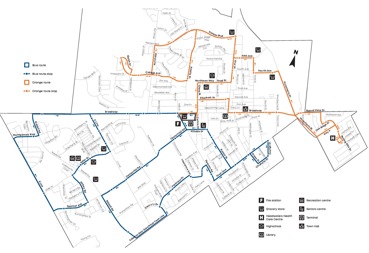 In some ways, the fare-free service in Orangeville is a success. Ridership more than doubled between 2019 and 2023, the year it introduced free fares. The program has since been extended through 2026. However, Orangeville Transit is a very small operation, with only two routes, each on a 45-minute schedule. The two routes are made up of circuitous, one-way loops that provide service to the entire municipality, but do not provide through or speedy service.