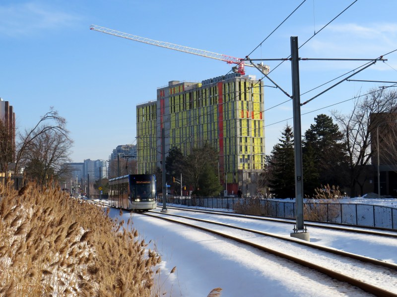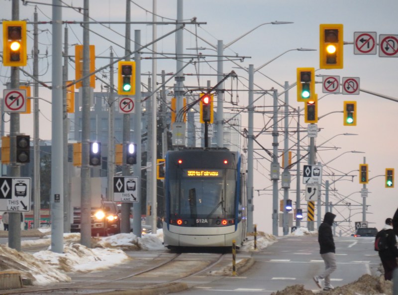 Despite the LRT working well, it is still far from perfect: there are several sections in which the trams crawl at a 10 or 15 km/h speed, particularly on the south end. At Hayward Avenue the route switches from a railway corridor to an alignment alongside Courtland Avenue; this section has two tight turns and crosses an industrial driveway. Had a few more properties been expropriated (at additional cost) this would not have been an issue. Until a proper protected pedestrian crossing is installed at a path connecting Trayner Avenue to Fairway Road (a critical pedestrian link that was overlooked during the planning phase), LRVs must also slow down along the hydro corridor approaching Fairview Park Mall.