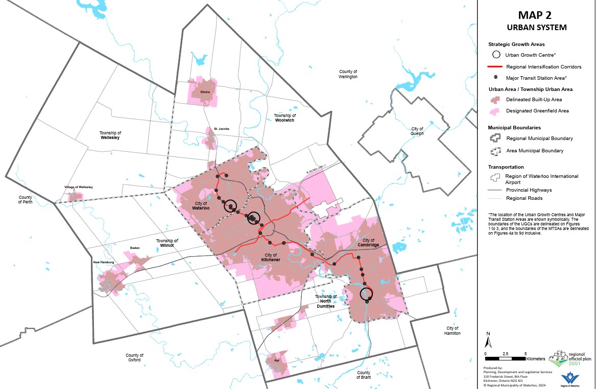 Waterloo Region is the smallest urban region in North America with a light rail system, and it works largely because of Kitchener-Waterloo’s geography. Many important regional destinations line up along the corridor: the terminals are both major suburban shopping centres that already functioned as major bus transfer points. In between the two malls are Downtown Kitchener and Uptown Waterloo, the two historic town centres, University of Waterloo, Wilfrid Laurier University, and Kitchener-Waterloo Hospital. The LRT serves or passes near all these destinations (though Laurier’s campus is centred a few blocks east of the LRT corridor). Furthermore, the region’s master plan focuses urban growth along the LRT corridor with new high-rise residential and mixed-use development. A planned extension of the LRT into Cambridge south to the historic Galt town centre will further support regional urban intensification goals.