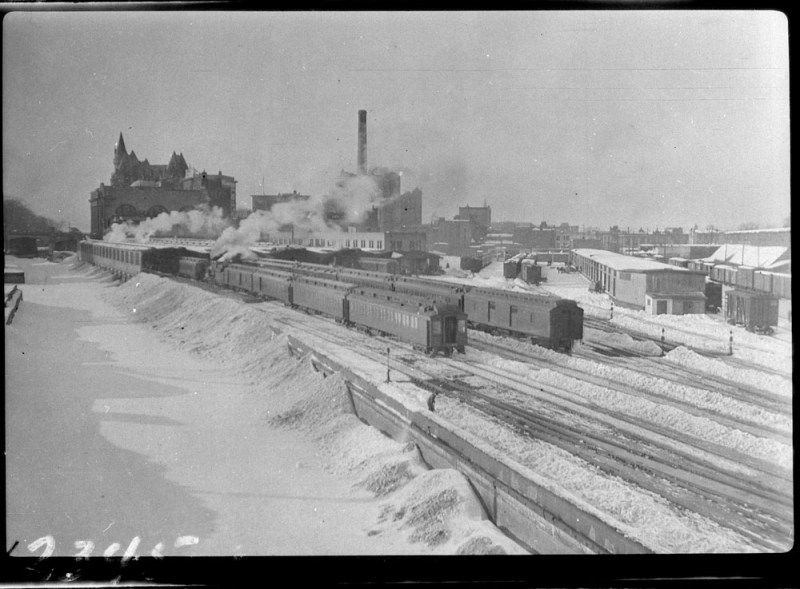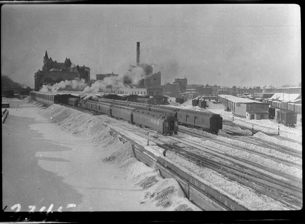 Approach tracks and Bush trainshed, Ottawa Union Station. A wintery scene, with a frozen Rideau Canal on the left. The yards at right are now occupied by the Rideau Centre, Convention Centre, and Department of Defense Headquarters (Library and Archives Canada)