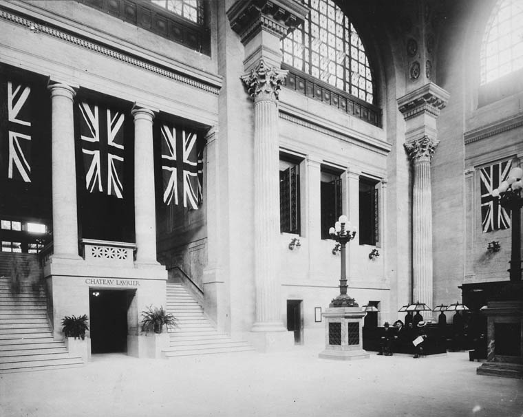 Entrance lobby, soon after opening. Note the tunnel under the staircase to the Chateau Laurier. (Library & Archives Canada)