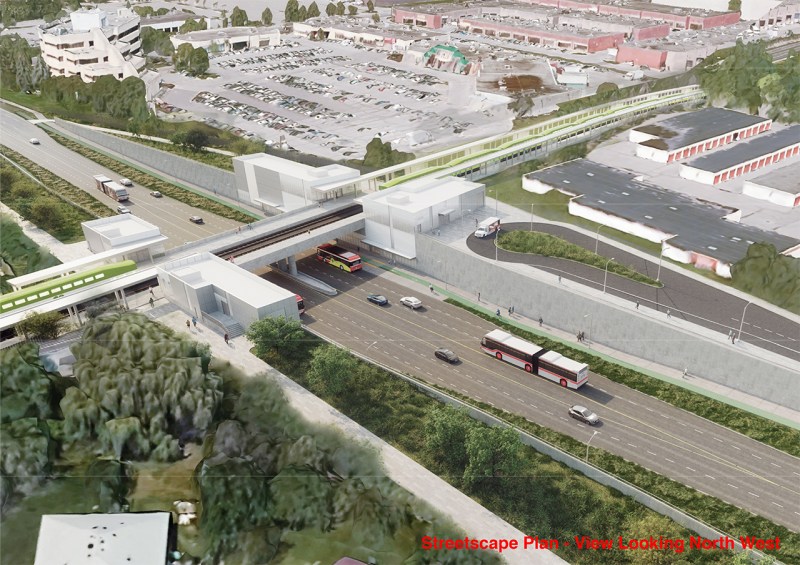 But the overpass was meant to be much more than just a rail bridge. A clue can be found in the construction site signage. Though the construction equipment is all marked for Green Infrastructure Partners (GIP), GIP is part of a project-specific consortium called “SmartTrack Construction Partners” or STCP, noted in a 2024 City of Toronto progress report. The SmartTrack name is interesting, as this was also going to be a site of a so-called SmartTrack station.